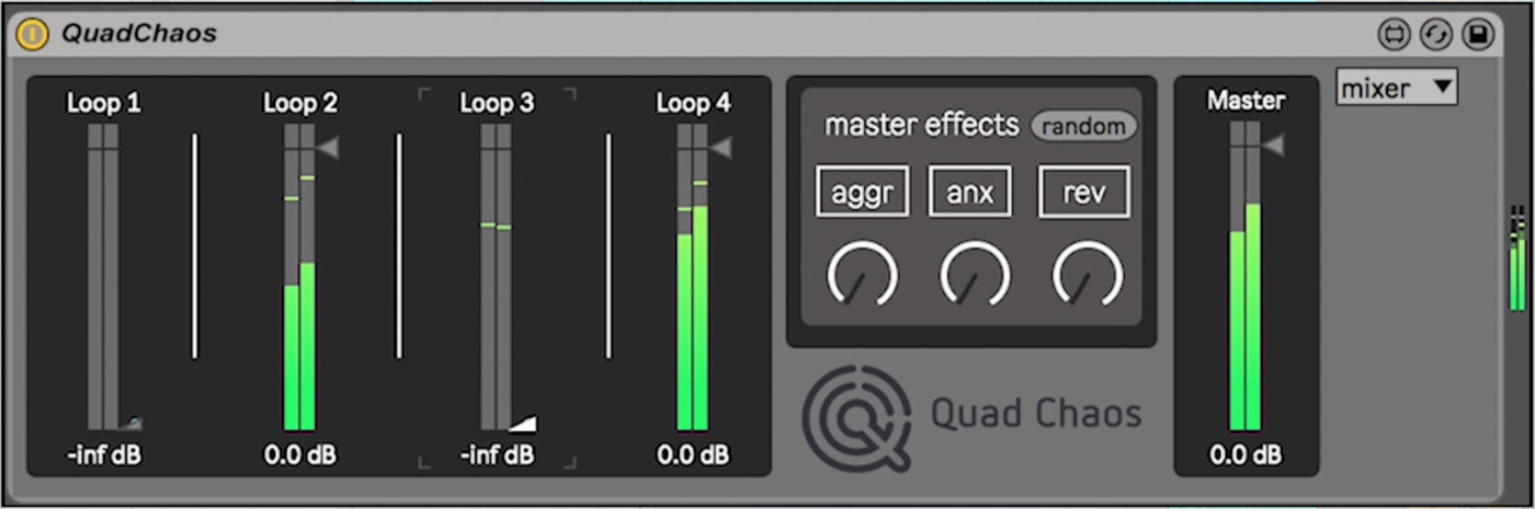 Quad Chaos features a fully automatable mixer that allows the user to mix the different loops independently through their own channel. It also features a master gain control, giving more dynamic independence to the device.